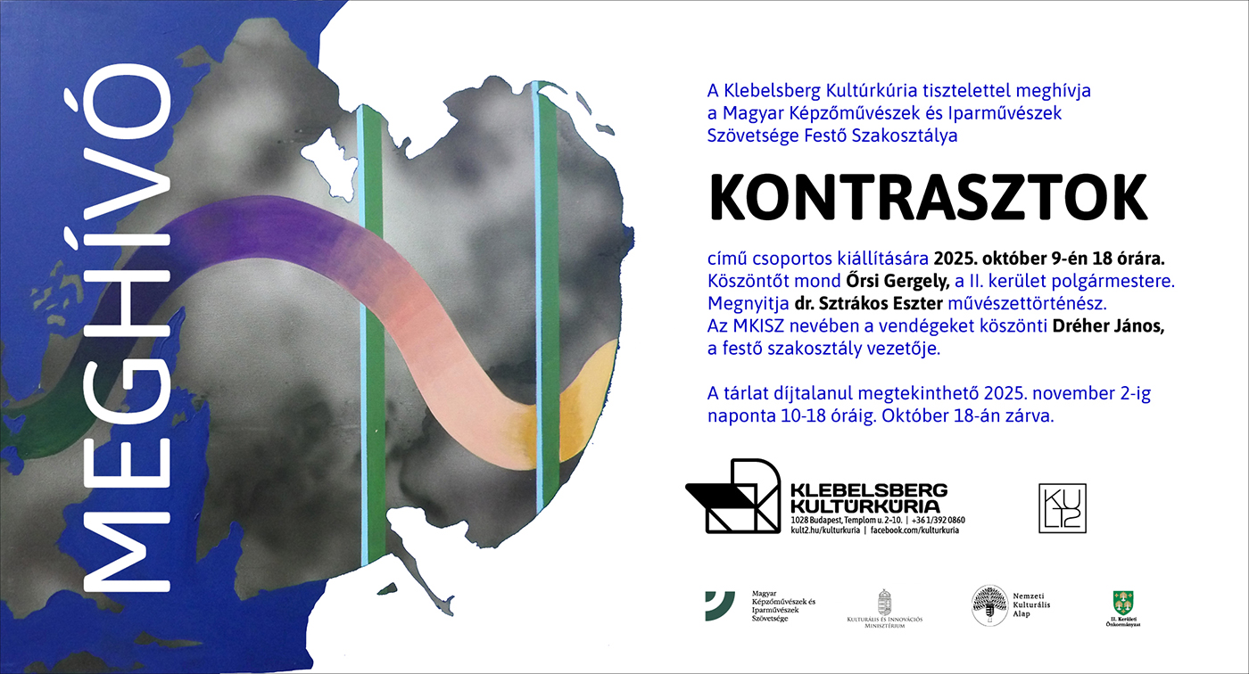 October 9, 2025 - November 2, 2025 Kontrasztok A Magyar Képzőművészek és Iparművészek Szövetségének kiállítása Megnyitó: 2025. október 9-én 18 órakor Megnyitja: dr. Sztrákos Eszter művészettörténész Az MKISZ nevében a vendégeket köszönti Dréher János, a festő szakosztály vezetője
